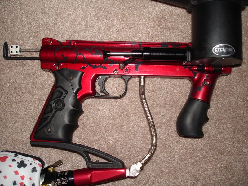 Custom paint: Black vine design over entire gun, with red background. Clearcoated for durability.