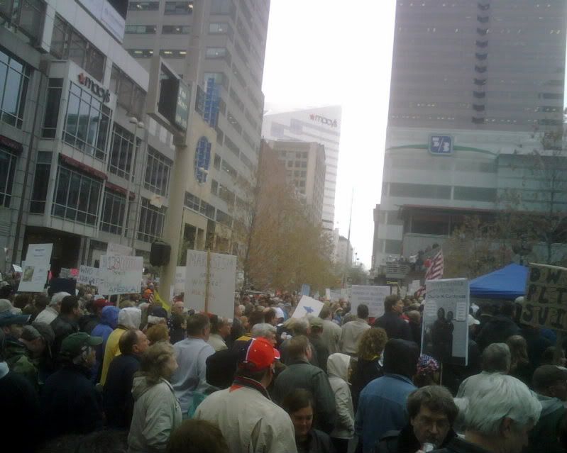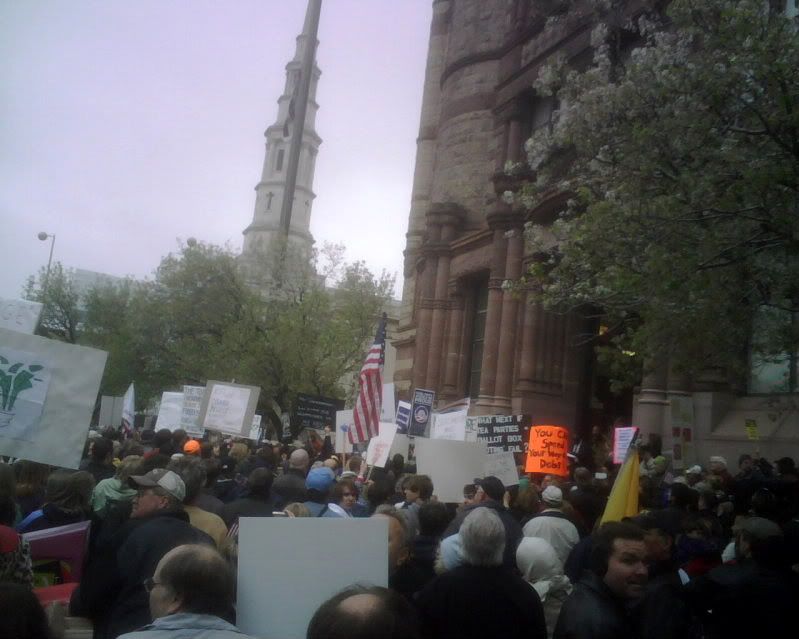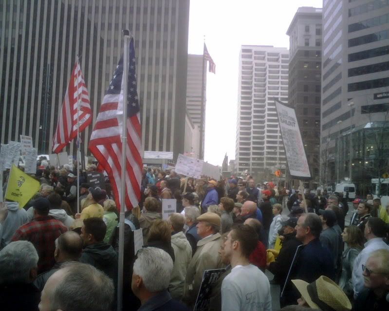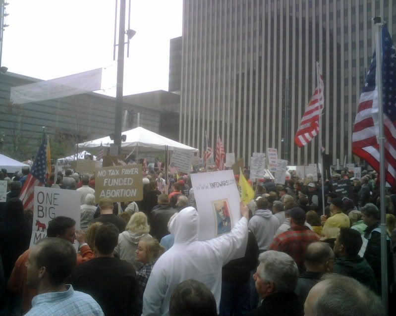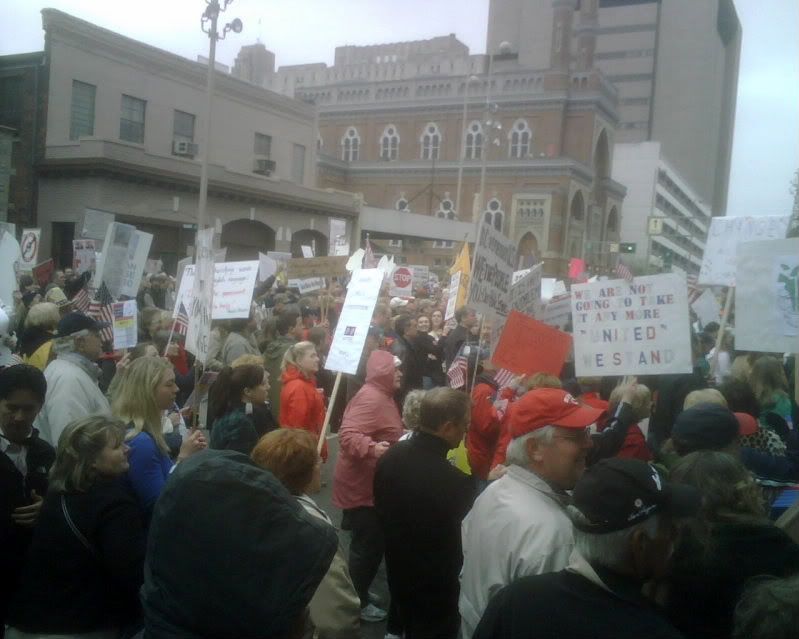 I just got back from the tea party in Cincy... Looked to be about 6-7,000 people and 3 protestors... I stood next to them of course, and watched as every single media outlet in the area came over to interview them... Radio, paper and tv...