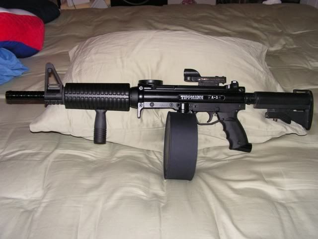 Here is my custom built A5-M4. The mag is made to resemble a Chinese 120rnd drum mag and actually will serve a purpose since it houses a large expansion chamber. I still need purchase a bipod and raised sight rail to finish it up.