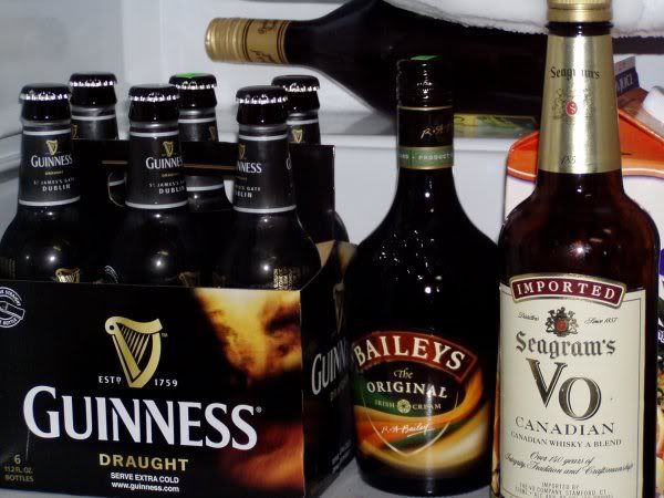 We have 3 6-packs of Guinness, a 6-pack of Killian's, some Rolling Rock, Red Stripe, and Honey Brown. Time to make a food run for my grill and pester a friend still at work.