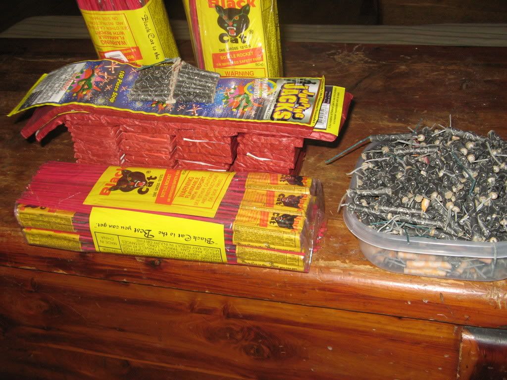 58 artillery shells, 7 bricks of firecrackers, two wheels that i plan to throw, one brick firecrackers, and two boxes of "p00t chasers" (named because they always seem to fly straight at me, p00t)
