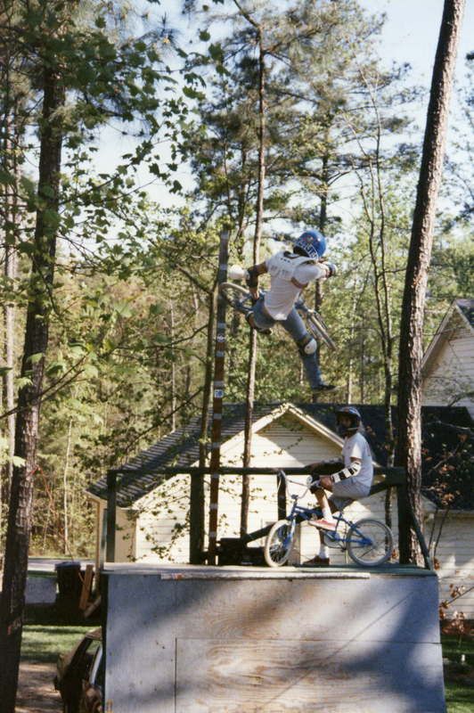 I grew up riding bmx bikes. I helped my buddy Jon built this HUGE halfpipe in his backyard. And of course, we started riding it before it was finished. We had the platforms up, but no railing yet.