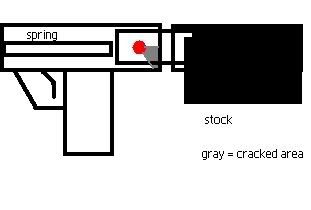 The crack goes to the bottom of where the stock is and is only 1/2 the gun. But the piece is completely free and falls out. When it does the stock falls off and the spring flys out.