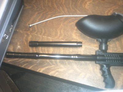 and here are the pics. The guy I traded with said it was beat up...what a liar! This marker looks almost NIB! He cleaned it up and out...took it apart, the whole 9...so I now have what appears to be a LNIB 98, stock 8 1/2" barrell, 14" SP Progressive, macroline and QLoader. The S/S hose is here too. I took oil and added it to the asa, removed the barrell and fired it 10 times. Degassed it, oiled the O-rings and sanded the inner bolt chamber. That's oiled too. This thing blows alot of snow...is that normal?