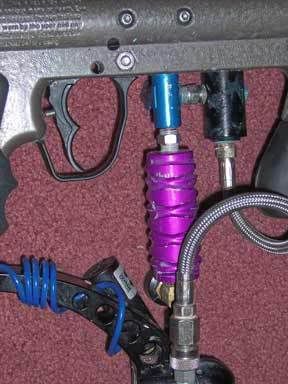 As for that blue "macro-line," it is actually Auto-Cocker pressure tubing that you'll see used for external plumbing on many pneumatic markers. It is very small diameter and low pressure (<100 psi). As we have changed our markers we damaged the small diameter line supplied with the E-Bolt kit. The line is used to connect the low pressure regulator (part of the Psycho-Ballistics  E-Bolt kit) to the solenoid which supplies power to the pneumatic ram. We substituted that blue line because that is what the Pro Shop had in stock.
