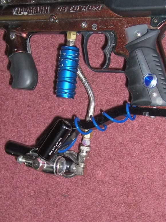 Which palmers is that. is that the female? I was thinking of a setup like that but my concerns would be the effectiveness of the horizontal stab with CO2, and the flow of the line from the reg to the LPC. what PSI does your sun run that at and does he have any problems with rapid fire? Also keep in mind that my setup is an A5. what I may end up doing if I do notice shootdown is just custom mill a chamber that comes off of the gauge port. The gauge is nice, but that I know we don't need. I just care about my velocity and don't need to be precise about what pressure I'm running at. I just want to try to half the pressure to about 350-400 without the response trig or the cyclone being affected. (I do have the lp feeder hoses already attached).  Thanks