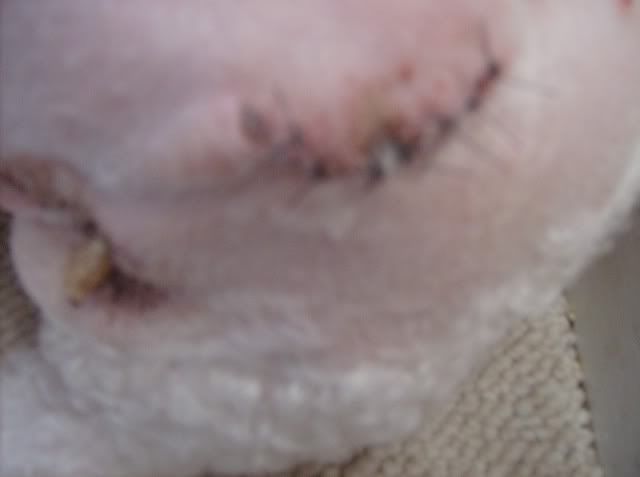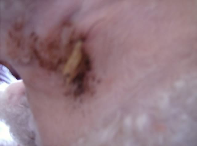 The drainage tube on the right side, built up fluids (and some blood) periodically drip out of it.  Its connected to a bulb like thing planted inside his neck  Two stitches here.: