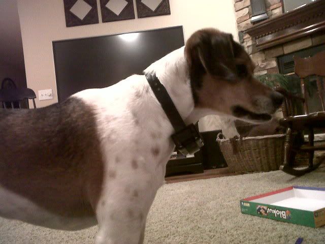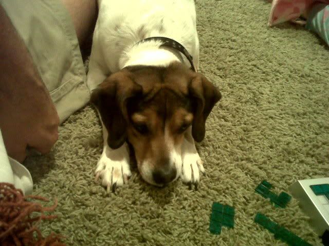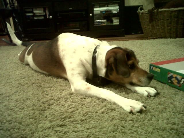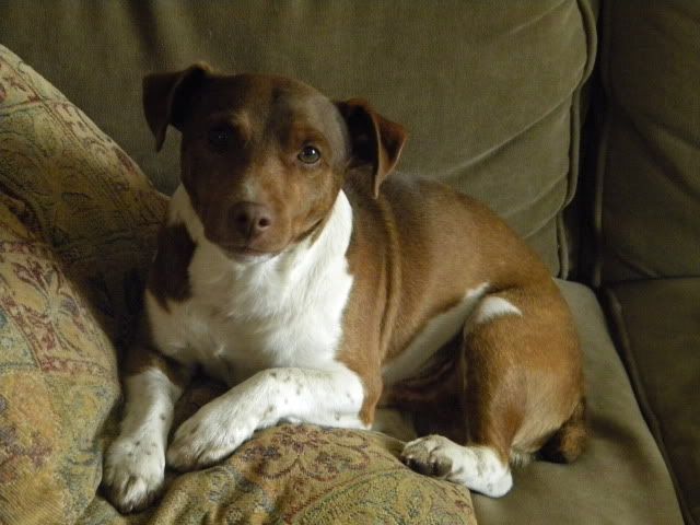 I thought all Jack Russells had short hair? Someone said the fact that he has spots is a little wierd..? I really am not that familiar with the breed. He was surrendered at the dog warden where we got him. Supposedly, he is eight years old, but the vet says he would have guessed more like 3, so I guess that means he's healthy. Everyone all says he is the calmest JR that any of them have ever seen. He's a pretty good dog overall, we have only had him for a few months, but he has fit in very nicely around here. Toby is a Humane Society rescue. We got him when he was only 3 months old. I really thought with the big goofy paws that he was going to be a lot bigger, but it didn't happen.